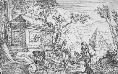 | 3 Bll.: Christus unter der Last des Kreuzes - Der reuige Petrus - Landschaft mit Sarkophag und Pyramide. | |