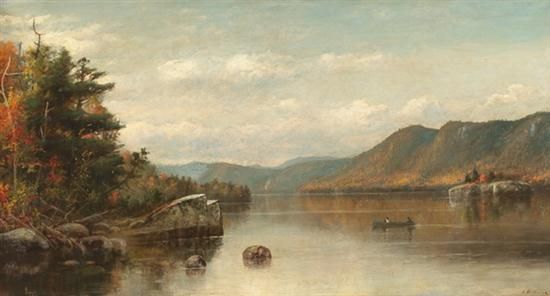 | HUDSON RIVER SCHOOL LANDSCAPE OF TWO MEN BOATING ON LAKE CHAMPLAIN, NY | |