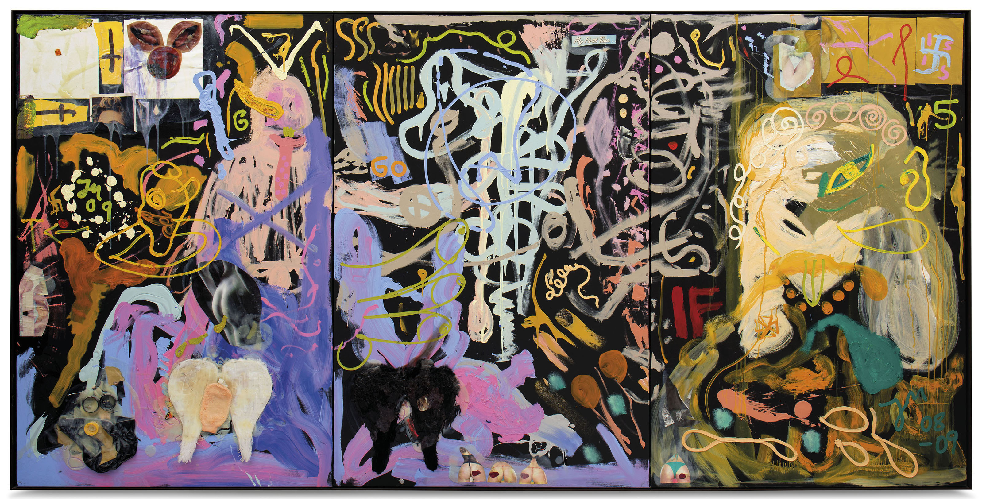 | Acrylic oil, found magazine collage, found scrub mitten, feathers and plastic on canvas | |