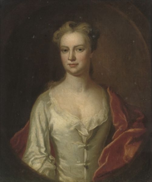 | Portrait of a lady, half-length, in an oyster satin dress with a red velvet wrap, feigned oval | |