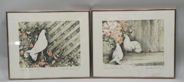 Summer Doves no's 1 & 2, doves with flowers by a fence