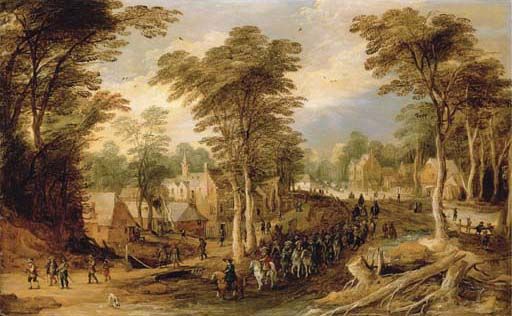 | A village landscape with a troup of cavalry and soldiers on a path | |