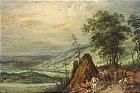 AN EXTENSIVE LANDSCAPE WITH WAGGONERS IN THE FOREGROUND
