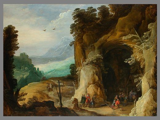 FELSLANDSCHAFT MIT WANDERERN UND BETENDEN IN EINER GROTTE
