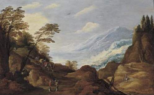 TRAVELLERS IN A MOUNTAINOUS LANDSCAPE
