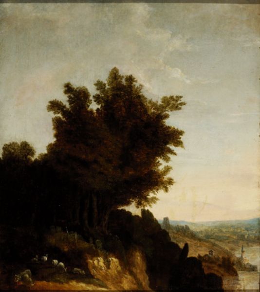 | Schaapherder met zijn kudde onder een boomgroep in een rivierlandschap | |