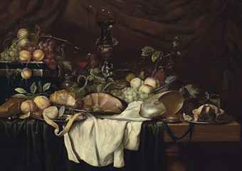 | Grapes, peaches, plums, lemons, oranges, a conch, an ornamental roemer, a ham, a minced pie and a gilt locket on a green velvet | |
