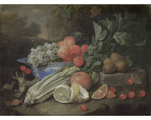 | Apricots and grapes in a Wan-li kraak blue and white bowl on a table ledge, with a peeled lemon, celery, cherries and walnuts, b | |