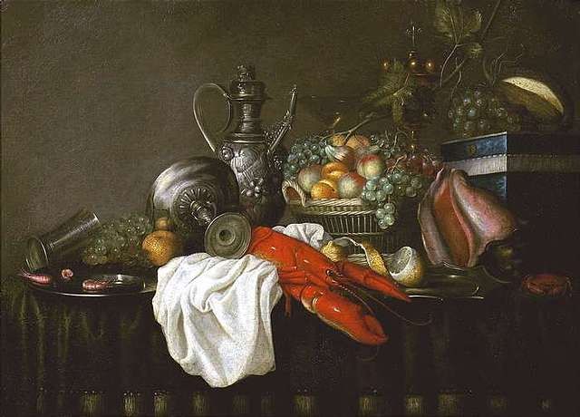| Großes Stilleben mit Früchtekorb, Prunkgeschirr, Hummer und Meeresfrüchten. | |