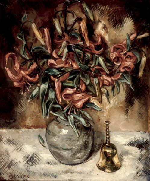 Stilleven met bloemen in een gemberpot en een tafelbel