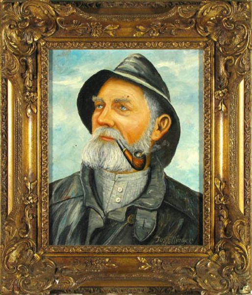 Brustbild eines pfeiferauchenden Fischers im Ölzeug mit Südwester