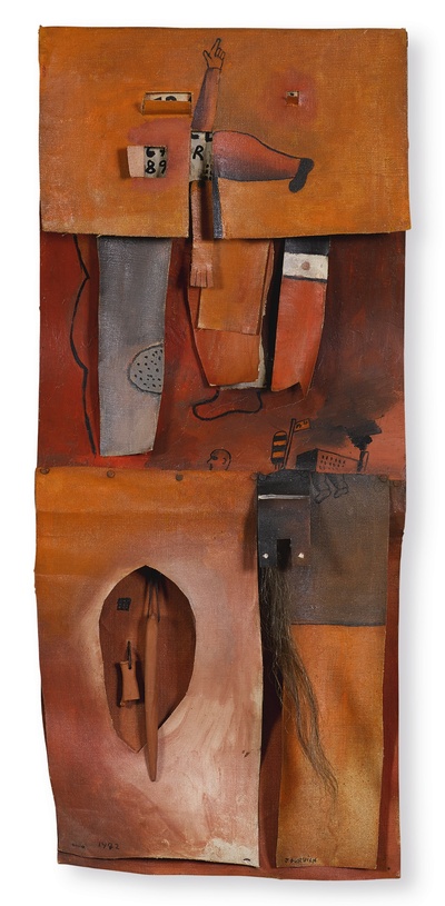 | Oil on canvas and wood with nails, string, natural fiber and ceramic | |