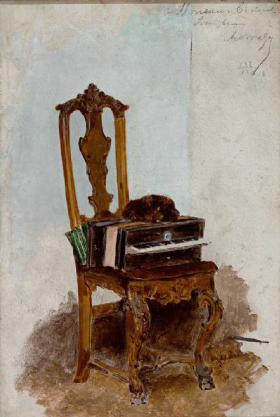 Stilleben mit schlafendem Hund auf Akkordeon und Barockstuhl