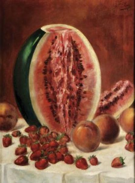 Natureza morta com melancia, pêssegos e morangos
