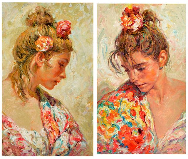 A pair of head and shoulders portraits of young women with flowers in their hair
