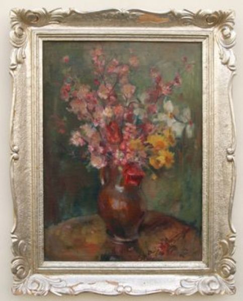 Kytice z tulipánů, bílých a žlutých narcisek a větviček s růžovými květy ve džbáně