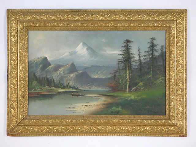 Mountain landscape with two men in canoe on lake