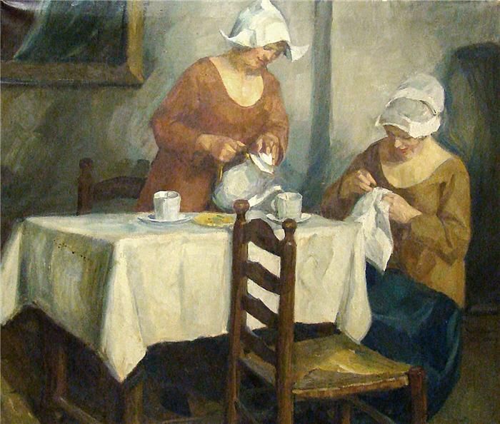 Holländisches Stubeninterieur mit Mädchen beim Kaffee