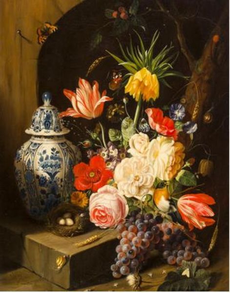 A still life with flowers, grapes and a blue & white jar on a marble ledge