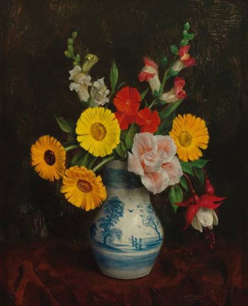 | Buntes Blütenstilleben in Birnkrug, sonnig beleuchtet vor dunklem Hintergrund. In typischer meisterlicher Manier | |