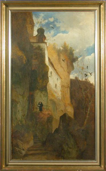 Blick auf ein Felsenkirchlein. Auf einem Vorsprung steht ein einsamer Eremit