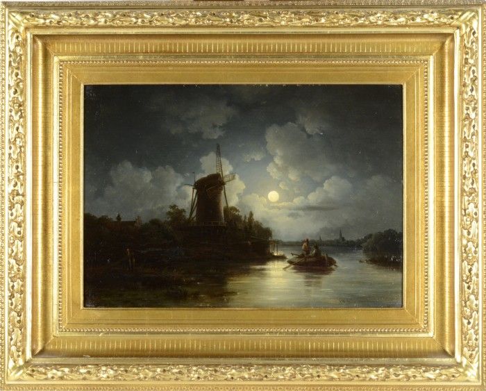 Månskenslandskap med roddbåt på kanal och väderkvarn