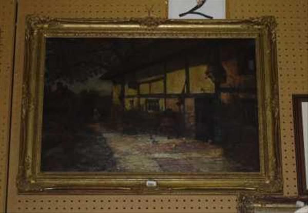 Female figure and hens before a cottage
