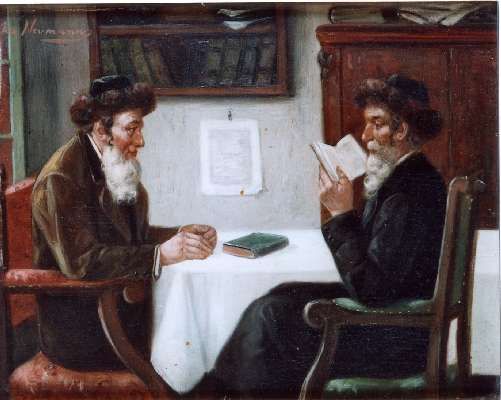 Interieur mit zwei Rabbis an einem Tisch - eine schwierige Stelle