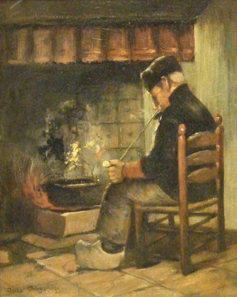Vor offenem Kamin sitzender Mann mit Pfeife