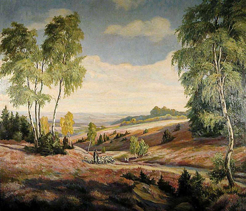 Wiesbaden, Blühende Heidelandschaft mit Schäfer und Herde
