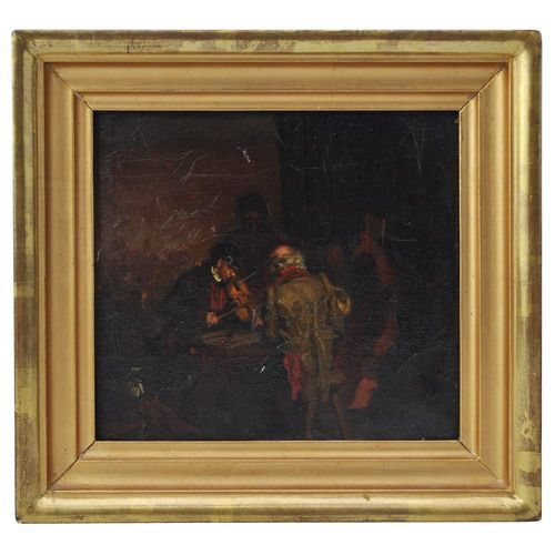 Interiör med fiolspelande man vid bord. Slitage, krackelyrer.