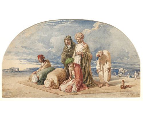 A group of Arabs at prayer, with distant camels