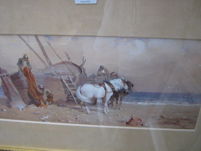 Beach scene with figures and horses by a beached boat