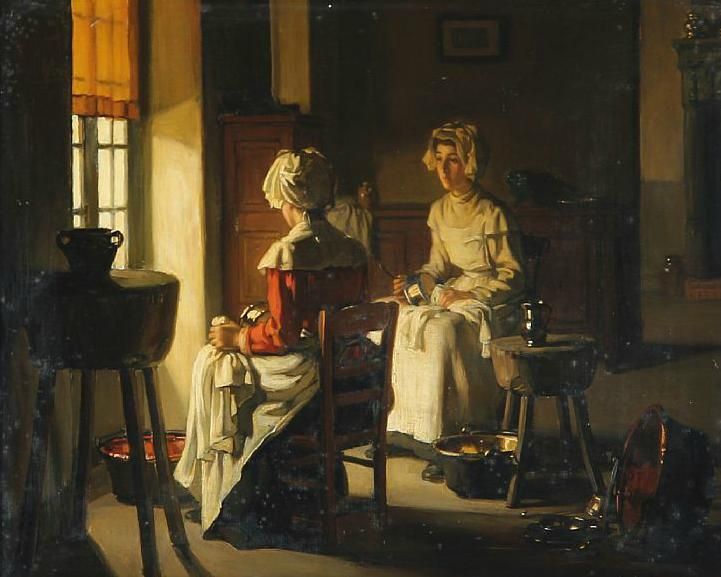 Interior with two women cleaning pots.