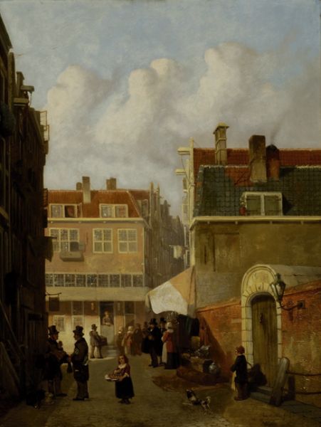 Hollands stadsgezicht met verzamelaars bij een antiekkraam