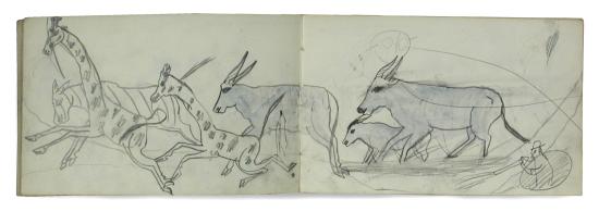| A sketchbook of animals - giraffes, zebras, horses, elephants, camels, gnu and a hare | |