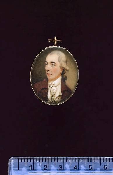 | A Gentleman, wearing brown coat, cream waistcoat, frilled white chemise, tied stock and powdered wig worn en queue with a black | |