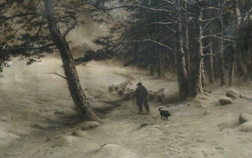 Shepherd and sheep in Winter-time