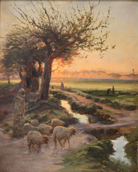 'Near Cairo' (Shepherd and Sheep within a Landscape at Dusk)