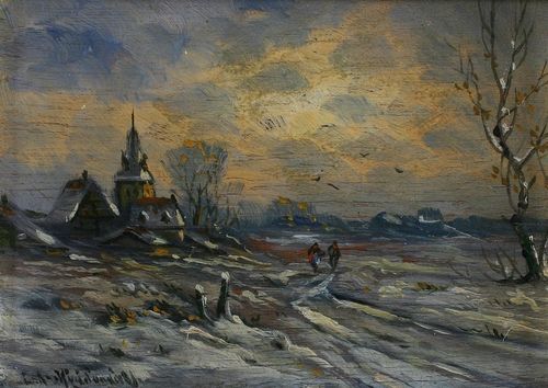 Verschneite Landschaft mit Personen vor Dorfkulisse