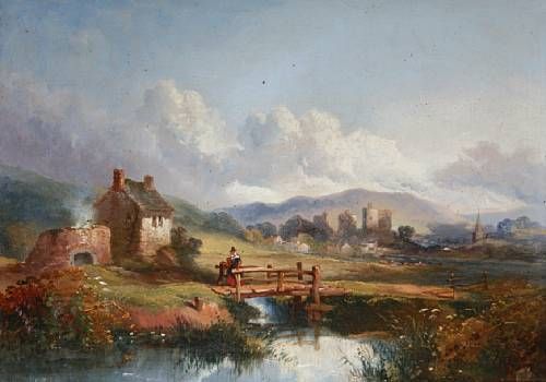 | A Welsh landscape, with a lady in Welsh costume crossing a bridge by a cottage, with a castle ruin beyond, possibly Rhuddlan | |