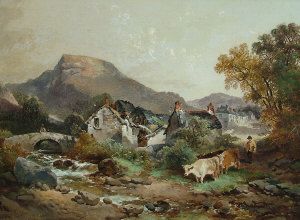 Cattle drover by a tumbledown cottage with a village and mountains beyond