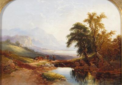 | Figure and cattle on a track by a river in a mountainous landscape | |