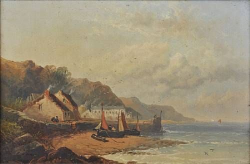 Figures and beached fishing vessels on the shore, before a row of cottages