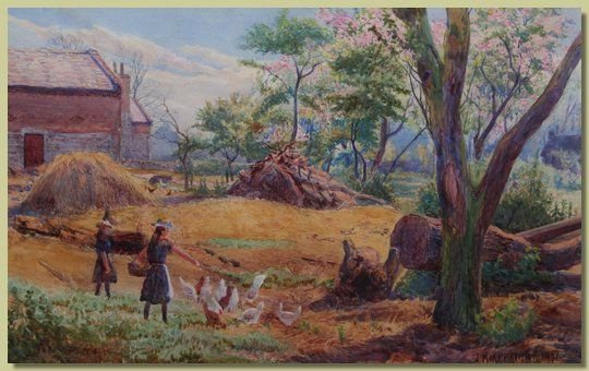 figures feeding chickens, farm buildings beyond