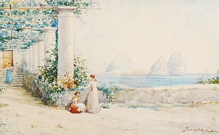 Boats moored on a Mediterranean shoreline and a companion with columns and figures to the foregroun