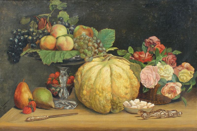 Still Life with Luscious Fruits, Squash and Beautiful Roses