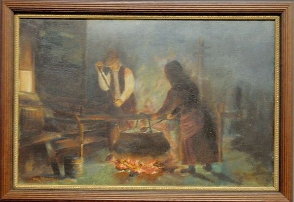 | a night scene with a man and woman tending a fire and kettle | |