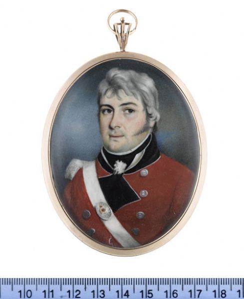 | An Officer of an Auxiliary Infantry, wearing red coat with white piping to the black facings and standing collar, silver buttons | |