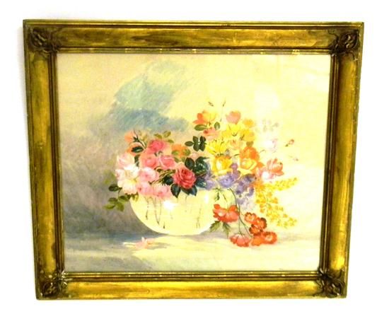 | still life of yellow, pink, orange, and red flowers in vase | |